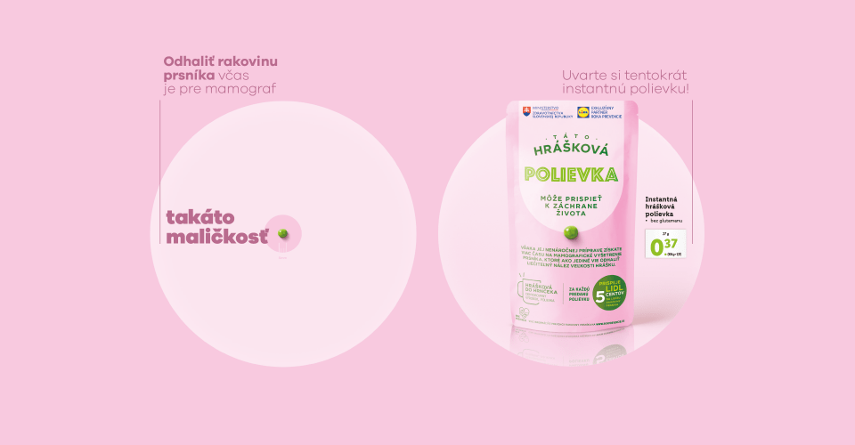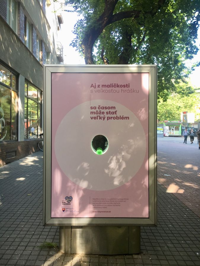 V septembri sa objavil záhadný citylight na Poštovej ulici v Bratislave. Po prečítaní bolo jasné, že je to veľmi dobre spracovaná kampaň boja proti rakovine prsníka, ktorá prizvukuje dôležitosť mamografického vyšetrenia. Hrášok symbolizuje niečo malé a metafora bola na svete.