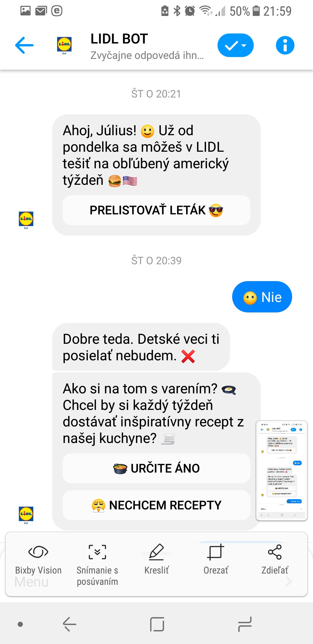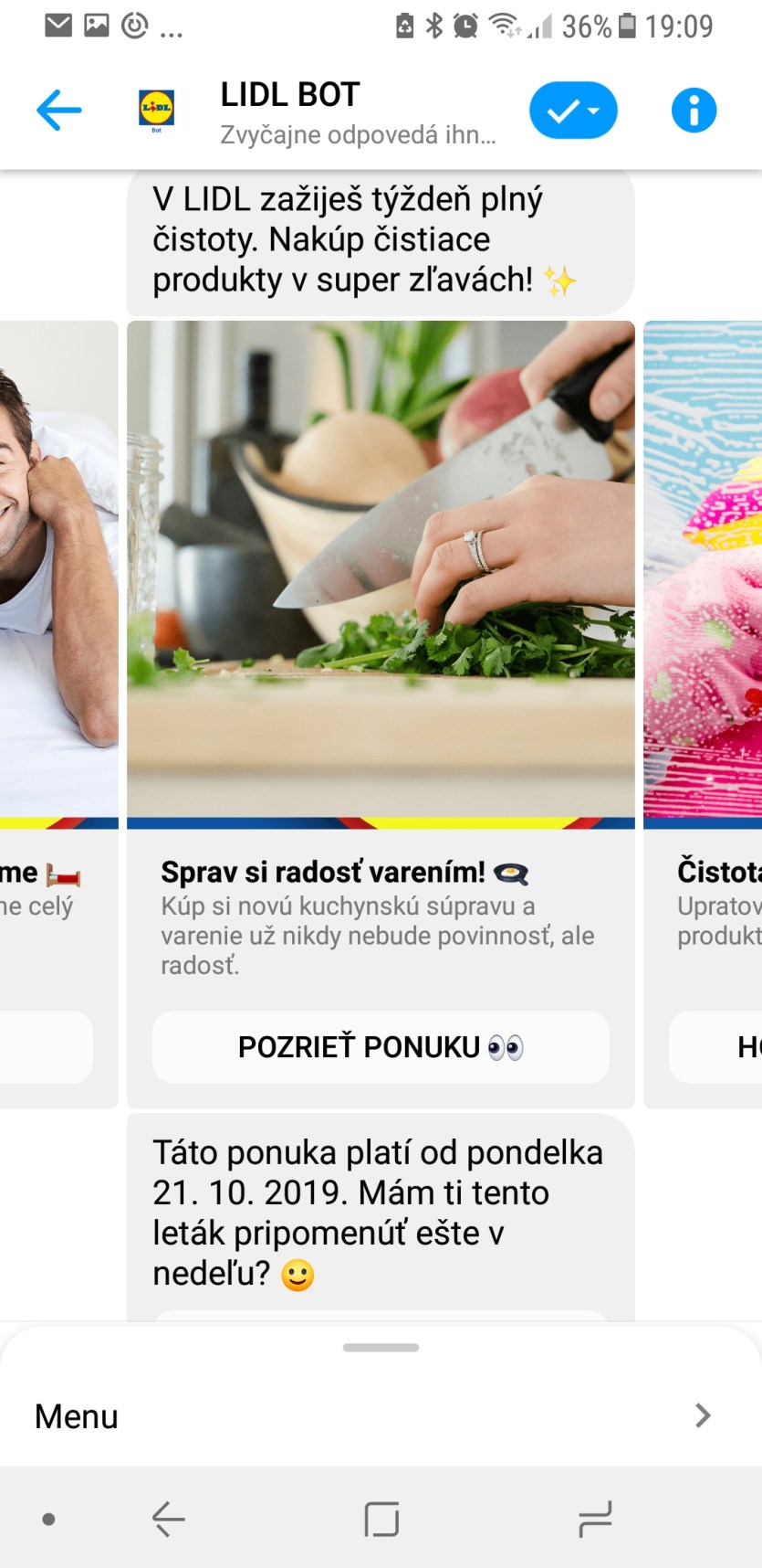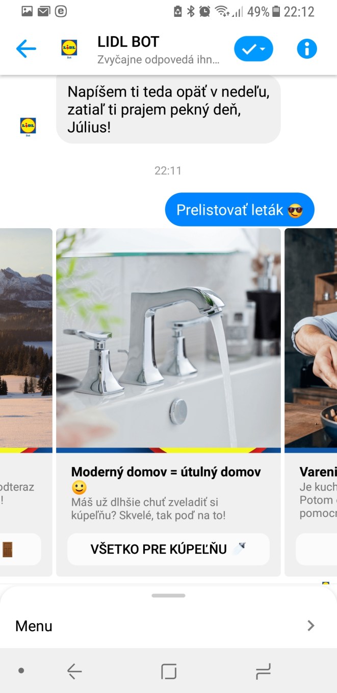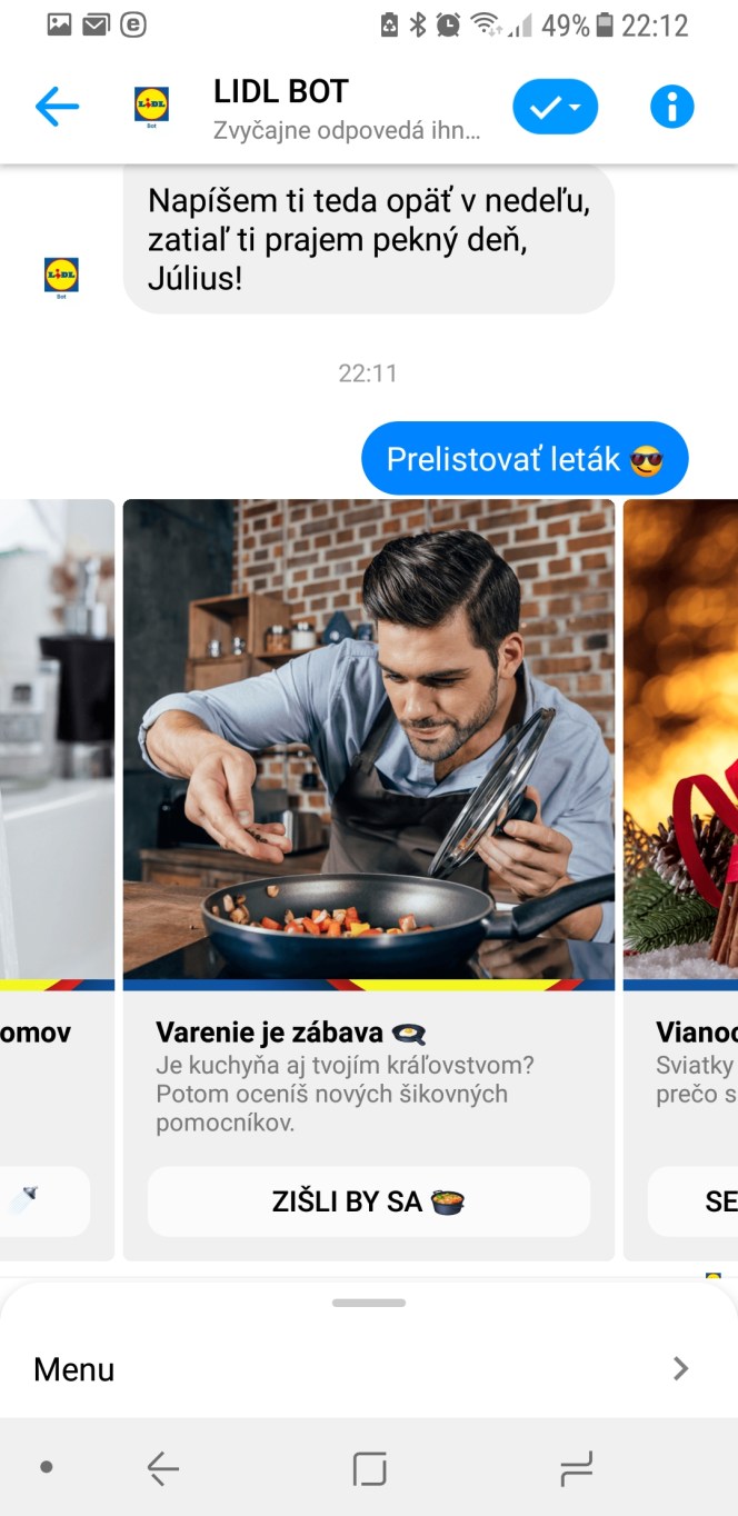 Sľúbenú personalizovanú ponuku mi poslali na messenger. Kde prišla správa presne podľa predošlého avizovania. Po kliknutí na možnosť “sprav si radoť varením” sa mi spustil Leták a bola nalistovaná presne strana o varení.