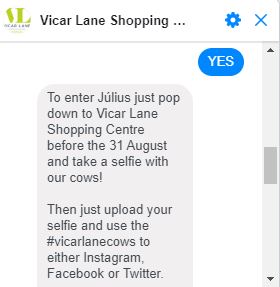 Chatbot môže slúžiť aj na zvyšovanie návštevnosti nákupných centier, v spojení s jemnou hrou psychológie. Nákupné centrum Vicar Lane spustilo v júli kampaň “Pomenuj kravu z trávy”. Súťažiaci sa zapájali do hlasovania pomocou chatbotu. Podľa Maybe sa zdvihla návštevnosť až o 29%.