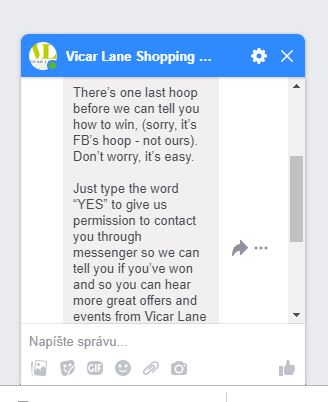 Stručne o funkcionalite Chatbot. Jedná sa o chatovacieho robota využívaného cez Facebook messenger. ChatBot znamená, že na druhej strane konverzácie nie je človek, ale algoritmus vyhodnocujúci odpovede a reakcie, na ktoré reaguje preddefinovanými odpoveďami. Zväčsa sa jedná o zatvorené otázky, kde sú na výber iba dve varianty formou áno/nie. Môžeme sa stretnúť aj so sofistikovanejšími chatbotmi, ale tie už majú zložitejší algoritmus založený na strojovom učení.