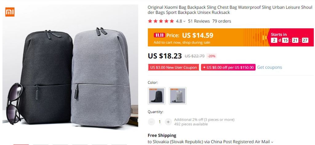 Akcia na daný ruksak začína až 11.11. a cena bude výrazne nižšia, čo núti zákazníka oddialiť nákup. Celá stránka je plná kupónov, ktoré platia iba na Singles day. Môžete si dať produkty s kupónom do košíka a čakať. Tento prístup však majú takmer všetky e-shopy, ktoré idú do Singles day. Obrovský nárast v daný deň je teda z veľkej miery kumuláciou nezrealizovaných nákupov z predošlých dní, keďže zákazníci čakajú na spustenie zliav.