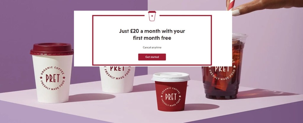 Návštevnosť klesla počas lockdownu na minimum pravdepodobne všade. Pret, britská sieť kaviarní, sa rozhodola, že si stratu na návštevnosti vykompenzuje predplatným. Ponúka mesačné predplatné kávy so sebou “Your Pret Barista” za 20 libier. Prvý mesiac dokonca sľubujú zadarmo. Má to aj obmedzenia ako maximálne 5 káv denne a odstup medzi jednotlivými kávami musí byť 30 minút.